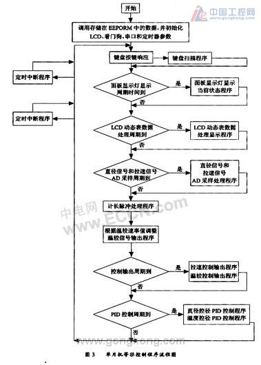 系統程序由初始化程序、AD采樣子程序、鍵盤掃描子程序、PID控制子程序和中斷子程序等部分組成。初始化主要完成熱控制系統各部件的初始化和自檢。鍵盤掃描和控制算法等子程序利用80C196KC豐富的中斷資源,在外部中斷和定時器溢出中斷子程序中完成上述工作。與上位機的串行通信采用80C196KC自帶的UART硬件傳輸中斷,以滿足數據雙向傳輸的異步性和實時性要求。單片機等徑控制程序流程如圖3所示。