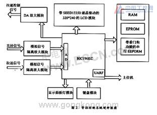 等徑控制系統硬件框圖如圖2所示。硬件核心為Intel公司的16位單片機80C196KC。存儲模塊由三部分組成:RAM,為程序運行時中間變量和局部變量存儲使用;ROM,為固化的程序和數據存儲使用;帶看門狗的串行EEPORM為芯片X5043,一方面存儲重要的工藝曲線數據和PID控制算法參數,另一方面為防止程序死機,X5043具有看門狗功能,并且當程序死機重啟時,X5043還保存有實時的工藝過程狀態數據。本系統硬件還包括數據前端預處理模塊,此模塊對采樣的模擬信號進行隔離放大濾波處理,以達到80C196KC:的AD采樣信號要求。LCD模塊為液晶驅動芯片sed13350驅動320*240的:DMF5008l的LCD。DA模塊采用四路的DAC7615,以便控制系統功能擴充。整個硬件系統可實現的功能完全滿足等徑控制的要求。