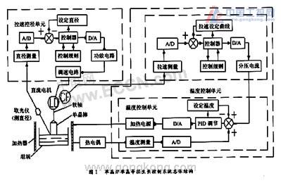 直拉式單晶爐是以直拉法從熔化的多晶硅熔液中生長硅單晶的電子專用設備。而等徑控制是單晶爐自動控制的核心。單晶直徑在生長過程中可受到溫度、提拉速度與轉速、坩堝跟蹤速度與轉速、保護氣體的流速與溫度等因素的影響。在忽略一些干擾因素影響情況下,單晶等徑生長主要受溫度和拉速影響。因此,爐內熱場和生長速度的精確控制是單晶等徑控制的重點,由于這種控制系統是一個緩慢時變,并且具干擾嚴重的非最小相位系統,用一般常規儀表控制手段來實現自動控徑極為困難。本文從硬件和軟件設計方面介紹了以80CI96單片機作為核心部件的單晶爐等徑生長控制系統,此系統有效地實現了單晶爐的等徑控制。